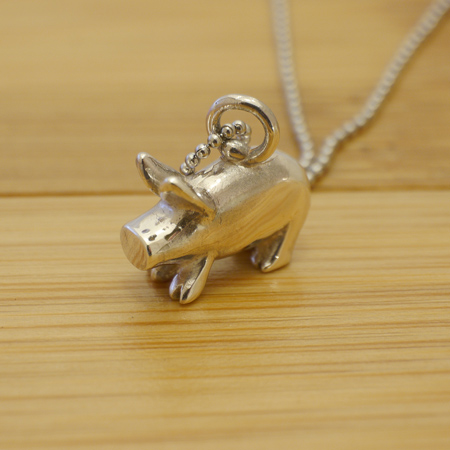 顔はあえて表現せずシンプルに仕上げました。ブタ(豚、ぶた)は古来より幸福と金運のシンボルとされてきました。四足で自立するのでお部屋のインテリアとしても活用できます。置いて眺めているだけでも愛着が増します。シュールでキュートな表情、しゃくれた鼻もかわいらしいぶたのペンダントはこちらです。他のぶたモチーフの品物は、ぶたリング、ぶたピアスミニ、はにかみぶたペンダント があります。