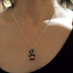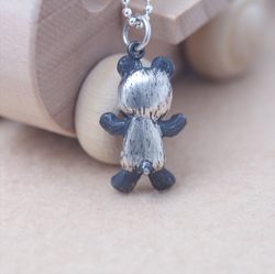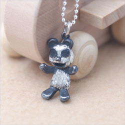 動物園の人気者・パンダがびっくりした顔でペンダントになりました。「わーおどろいた!?」と口をあけ、手を広げているところをあらわしています。パンダのトレードマークの白黒模様も表現しました。丸いしっぽもついてます。