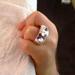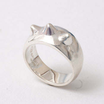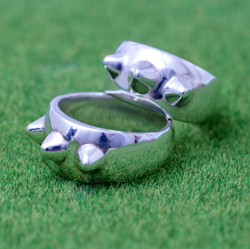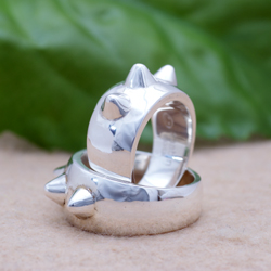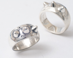幅の太目のリングにトゲを3本つけてみました。シンプルすぎて物足りない方には顔彫りオプション(下写真の左側、+1,000円)も選んでいただけます。ご注文の際に顔彫りオプション希望と明記してください。他の太めの指輪はでっかい星リング、海の大冒険リングなどがあります。