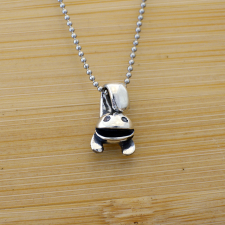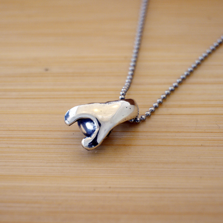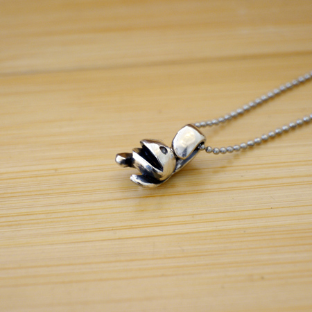サービンオバケ(わが社のマークです)が逆立ちしてしっぽが頭についているペンダントになりました。表情は不気味に笑顔です。オバケ型?人型のシルバー製ペンダント。店主が愛情込めて仕上げています。